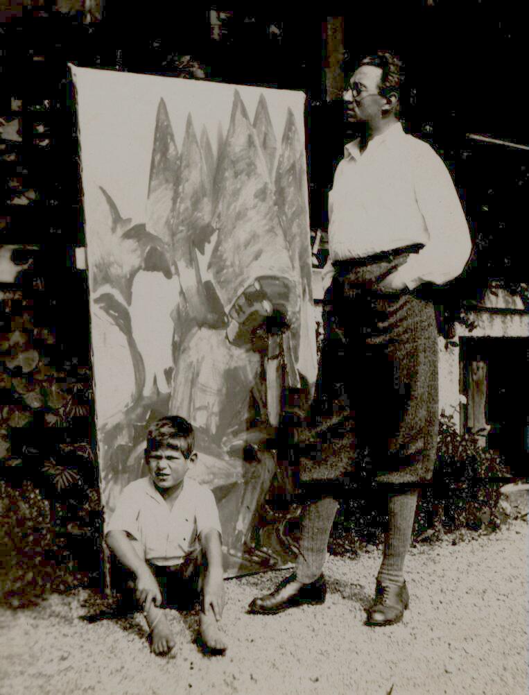 Sohn Hannsotto (sitzend vor Gemälde von F.S.) und Fritz Schaefler, ca. 1923