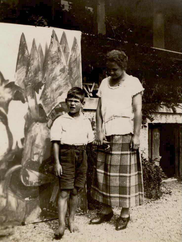 Hannsotto Schaefler mit Mutter Vera Schaefler vor einem Gemälde von Vater Fritz Schaefler, ca. 1923